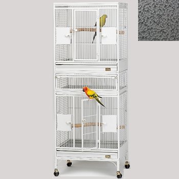 No nuts/bolts needed, thus easy to assemble.Quick knockdown for easy transport.Bird-proof door locks are used.Includes four stainless steel cups, two interior natural wood perches and a bottle of touch up paint.Removable grates and trays for easy cleaning.Food bowls are accessed from outside the cage for bird owner safety. Food bowls "lock in" the cupholder when the food door is closed so the bird cannot pick up and throw the bowl(s). Gold door latches and wheels/casters on white Multi Vista cages.Silver door latches and wheels/casters on platinum Multi Vista cages.All side panels come with removable nest box doors.